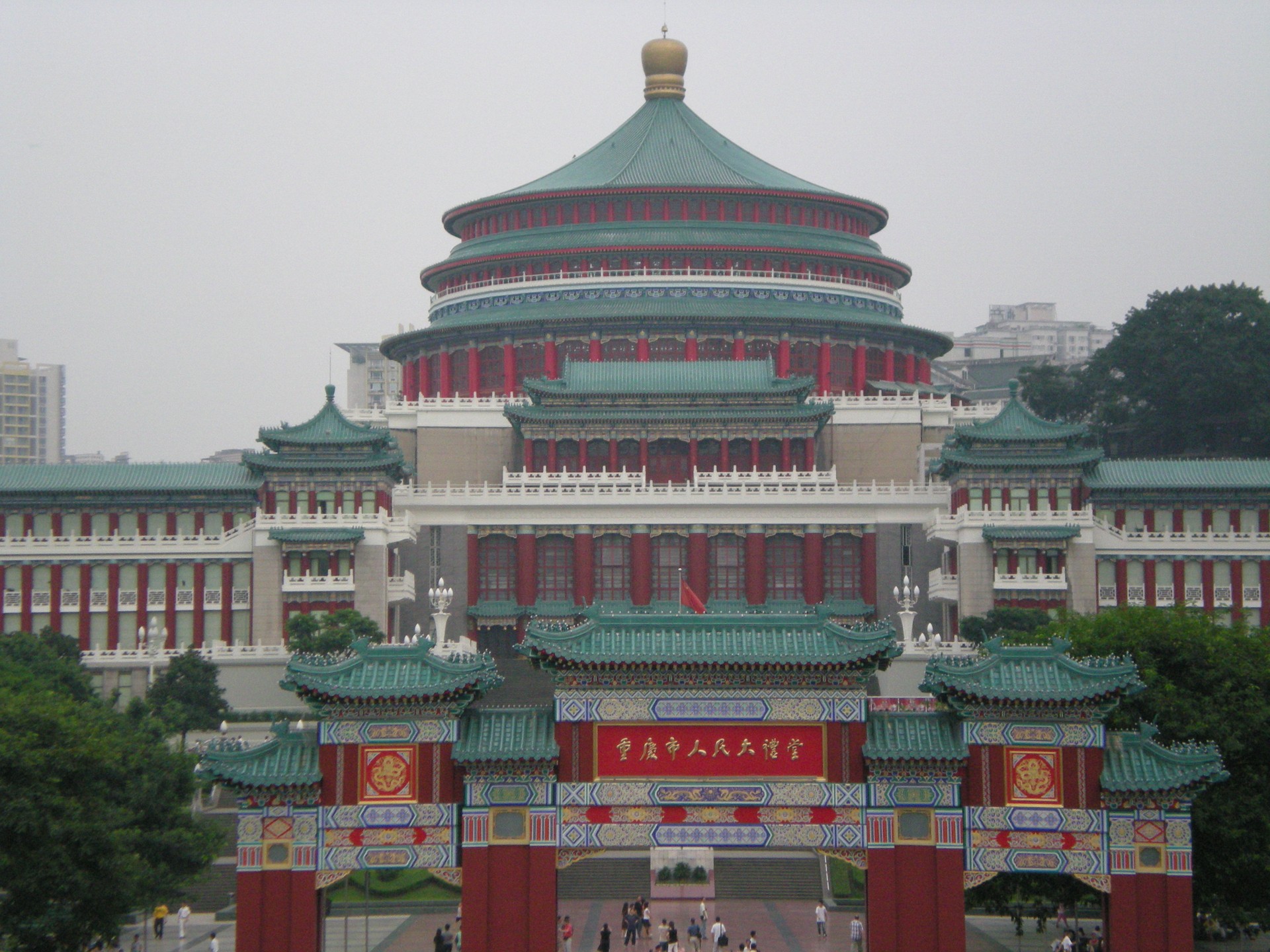 重庆人民大礼堂琉璃瓦顶、大红廊柱、白色栏杆、色彩鲜艳、对比强烈,重檐斗拱、雕梁画栋、金碧辉煌、雄伟壮观。